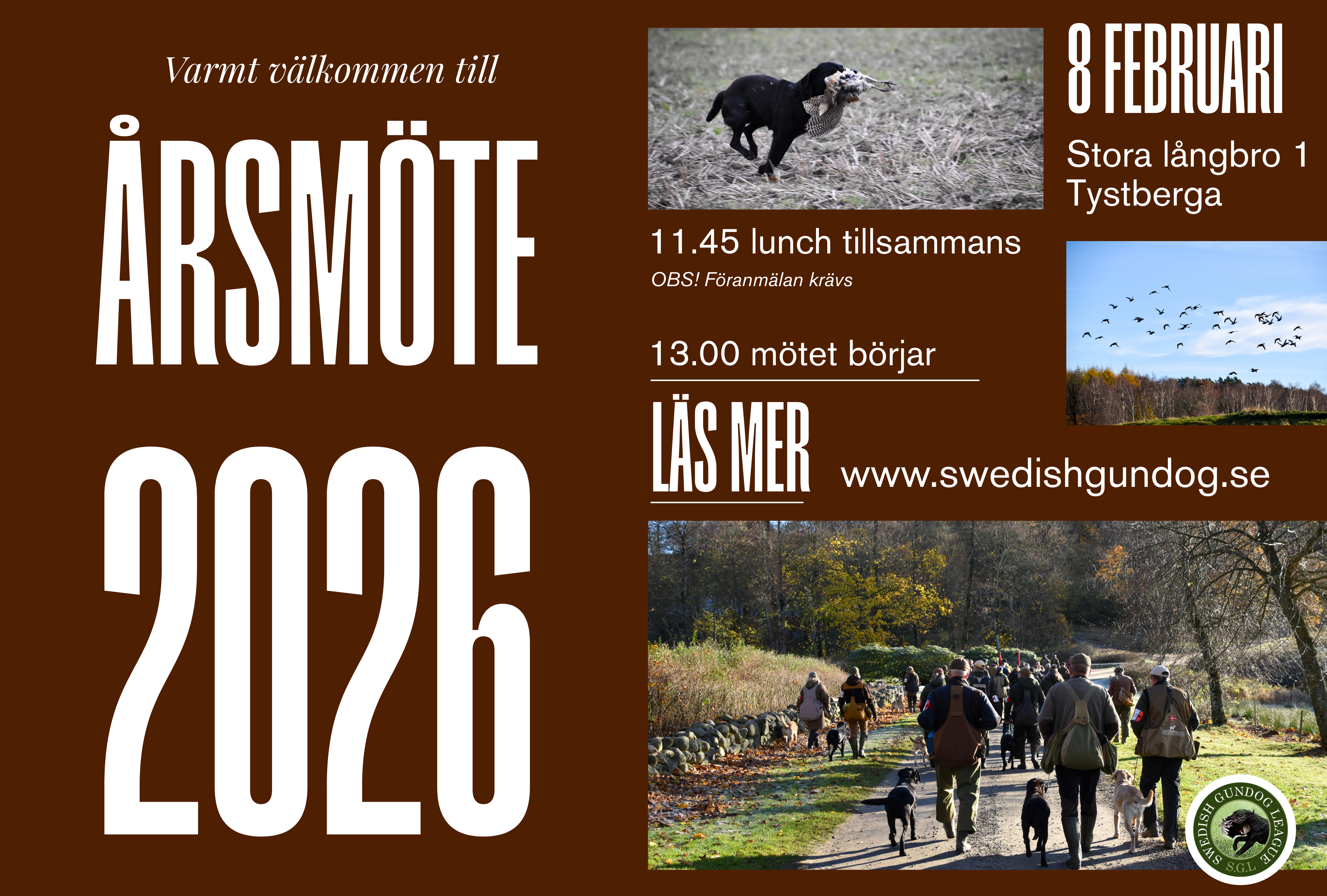 Innan årsmötet finns möjlighet att anmäla sig till en gemensam lunch. Anmäl till sekreterare@swedishgundog.se och ange eventuella kostrestriktioner. För att delta i själva mötet krävs inte någon anmälan - endast att du är medlem! Hoppas att vi ses!